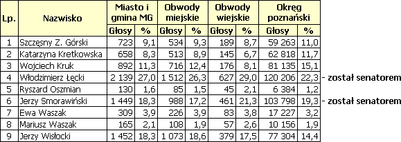Z obliczeń wynika, że w naszym okręgu (powiat poznański i Poznań) 33 % wyborców, a w naszej gminie 39 % głosujących wybierało tylko jednego senatora. Możnaby się zastanowić, skąd to wynika. Mogło to być niedoinformowanie wyborców jak mają głosować lub też ich świadomy wybór. Na rzecz drugiej możliwości przemawia to, że głosujący gdy wybierali tylko jednego senatora, to często był nim W. Łęcki. Mogli to być wyborcy o lewicowych poglądach, którzy mieli możliwość zagłosowania na drugiego kandydata z ramienia SLD-UP J. Wisłockiego. Widocznie nie chcieli na niego głosować z rożnych powodów (np. mniej znali kandydata). A może macie inny pogląd na tę sprawę - piszcie e-maile.
