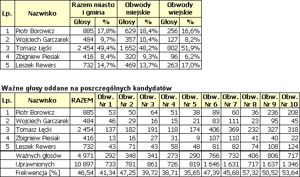 Miejska Komisja wyborcza ustaliła, że oddano 4971 ważnych głosów. Ponad połowa tych głosów wyniosła 2487. T. Łęckiemu do zdobycia fotelu burmistrza w pierwszej turze zabrakły 33 głosy.